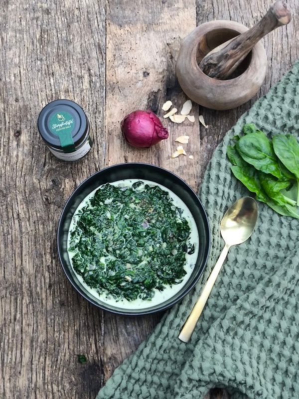 Jetzt nach und nach mit der Sahne angießen und den Spinat kurz aufkochen lassen.
